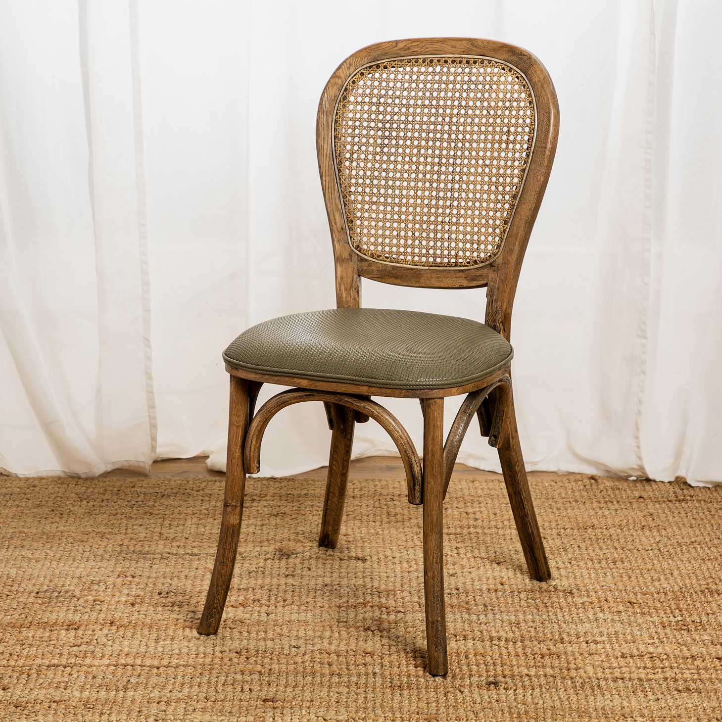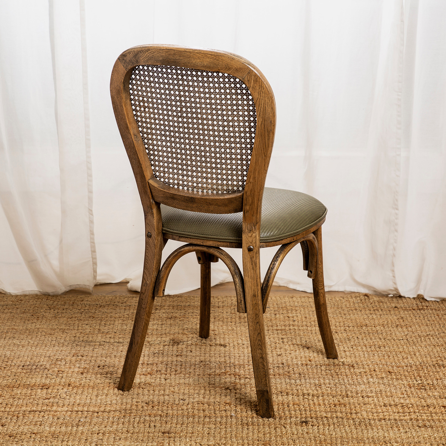 כיסא אוכל דגם ניקולס עשוי עץ מלא, משענת גב עשויה ראטן מושב מרופד PU בגוון ירוק.