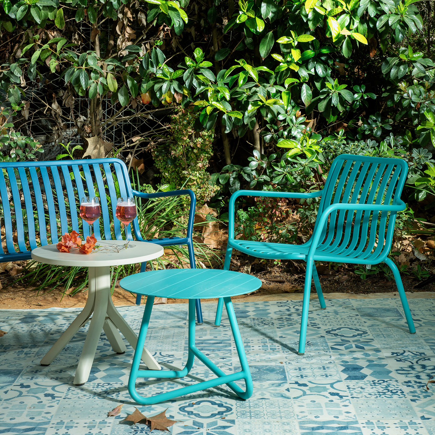 שולחן אלומיניום עגול ונמוך בצבע טורקיז מקולקציית RIVER.